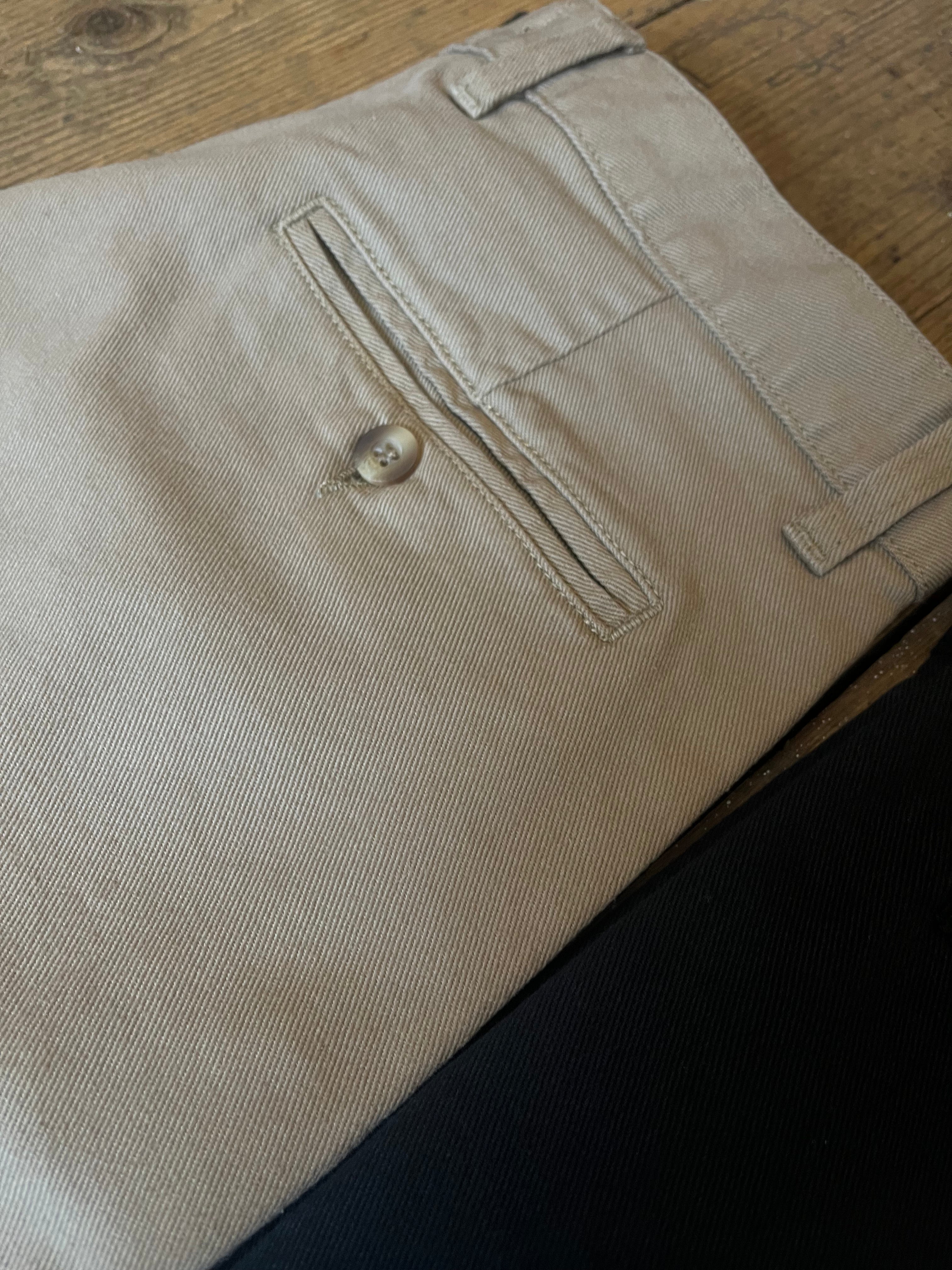 We had dabbled in making our own cotton, and denim jeans before, but this time it was different. So dissatisfied with what was available and knowing he could do it better, Jason set out to combine the best elements from his favourite chinos from days gone by. The result is something we are very proud of.
