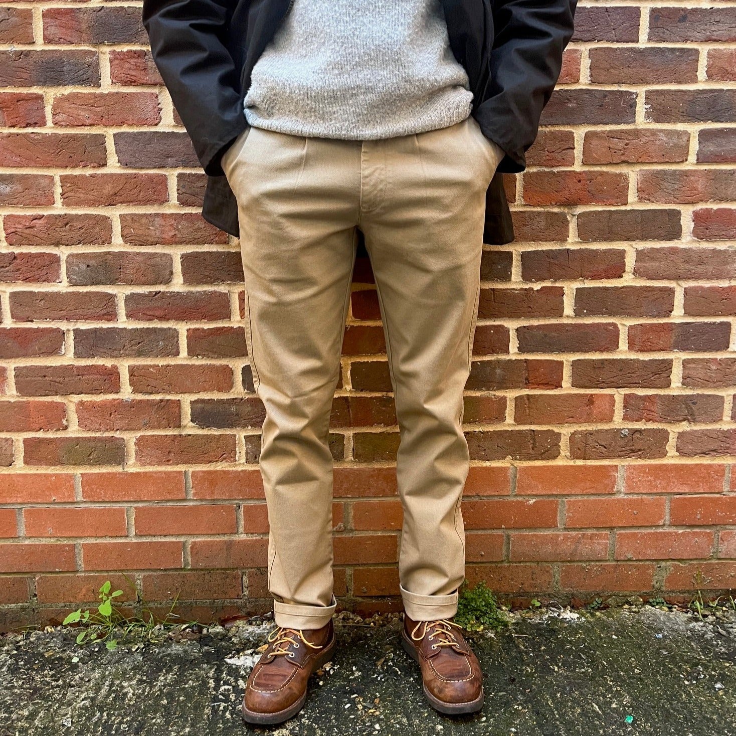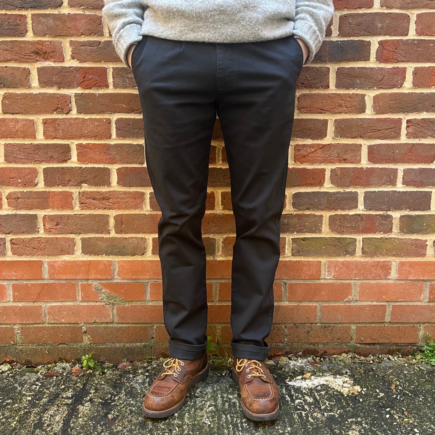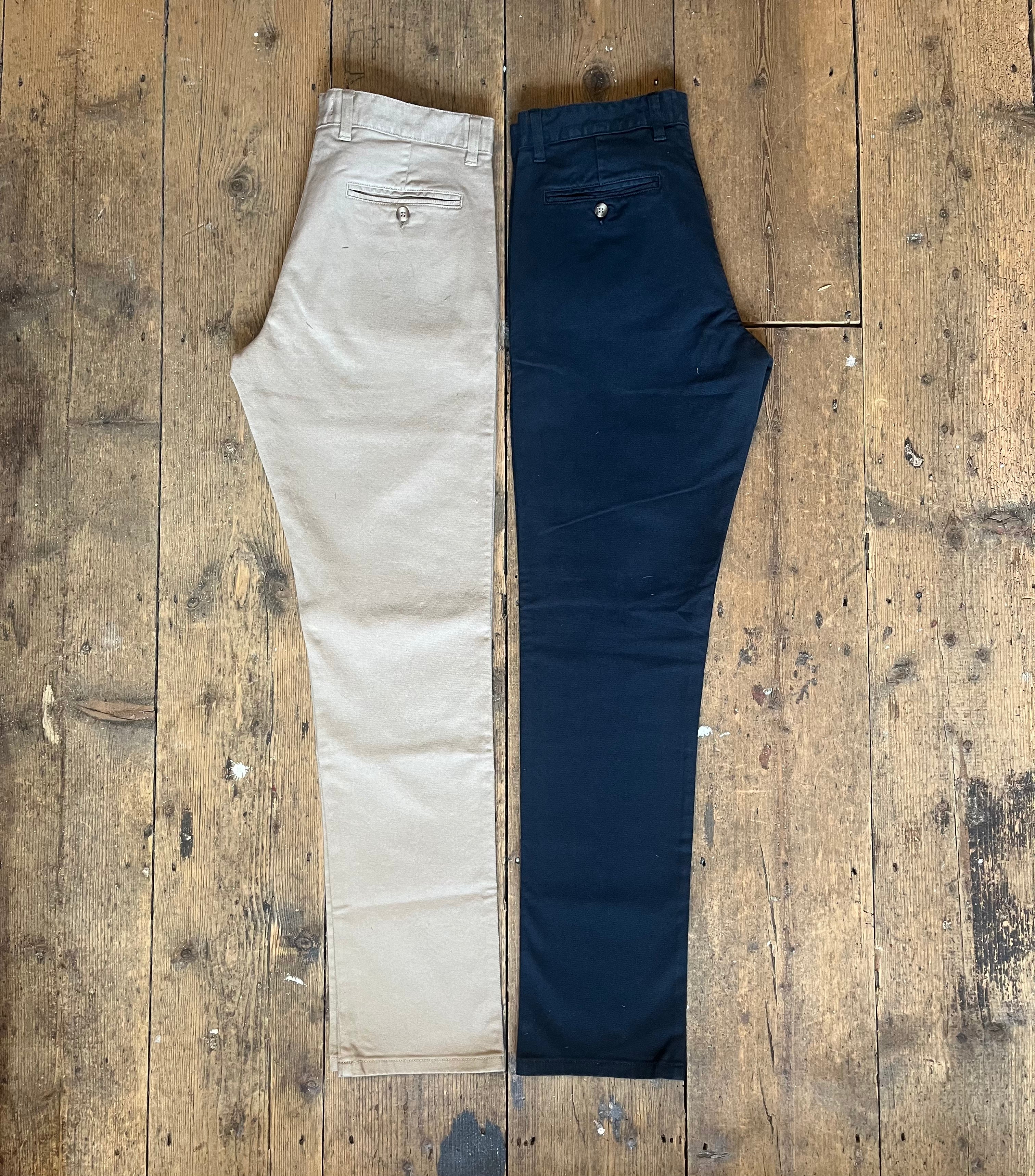 Jason started with getting the fit right. Many chino trends had come and gone in 20 years - some good, others genuinely terrible. Taking the best of these, and refining the cut over numerous samples we have refined our block to a subtle taper below the knee to the ankle, a loosely tapered thigh, and a medium rise. This has created a chino that has a contemporary silhouette but is smart enough for work and formal occasions.