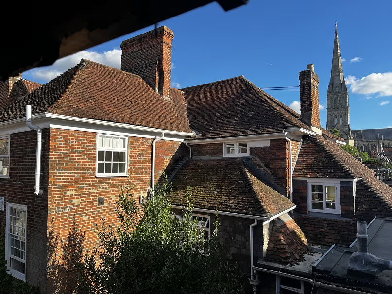 Salisbury Cathedral as glimpsed from the top floor window of the Regent shop, a listed building at 73 New Street