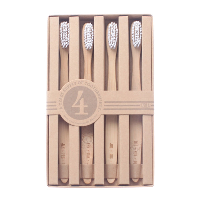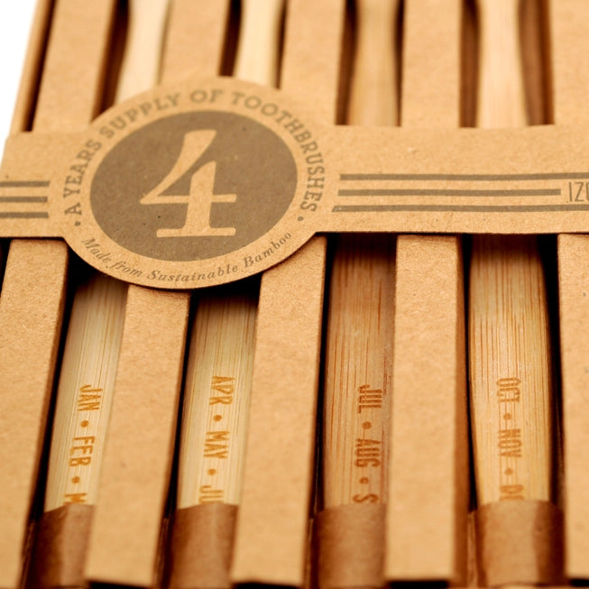 These eco toothbrushes are made from sustainable bamboo, nylon bristles and come in a 4 pack that have each month engraved on the bottom so you know when to update your brush.