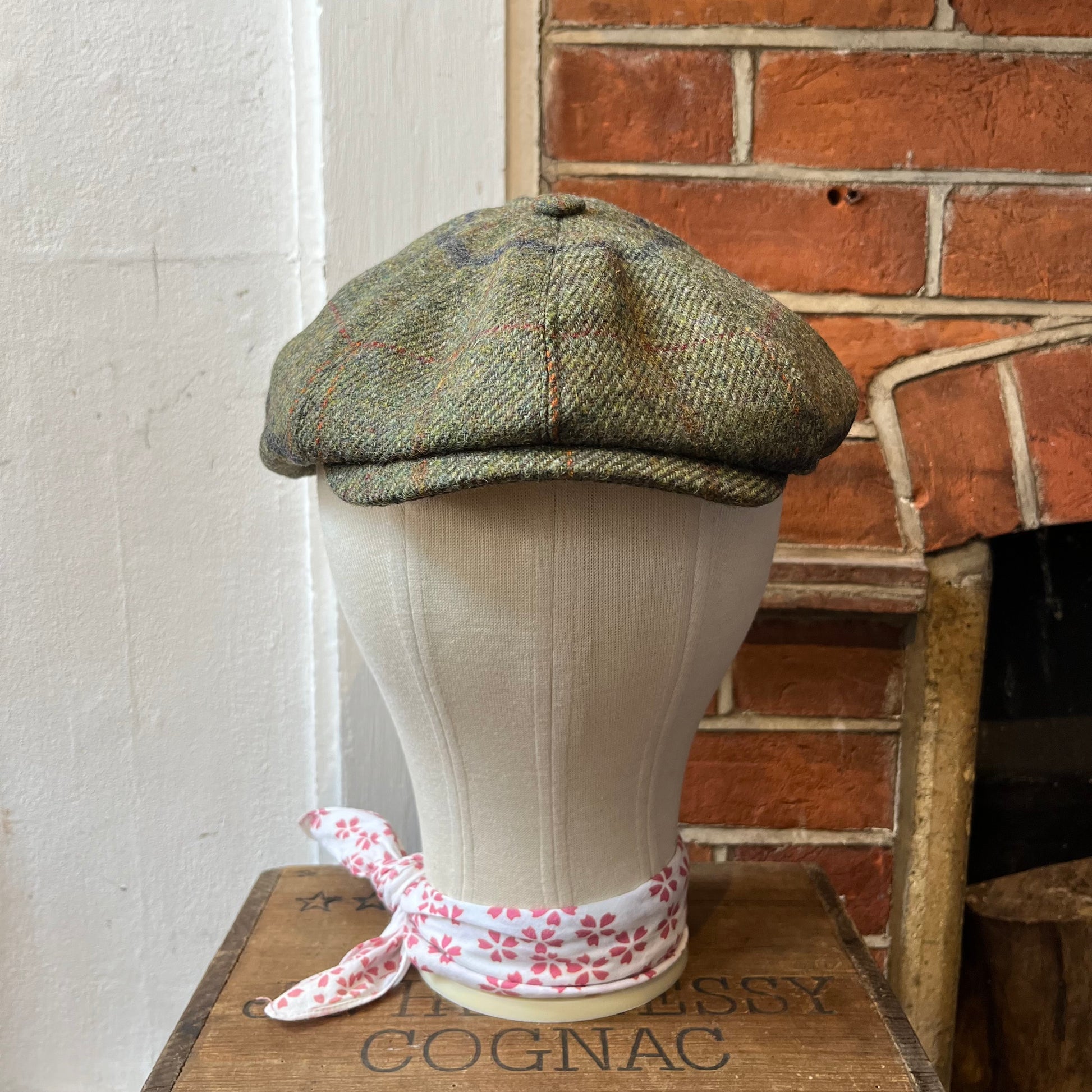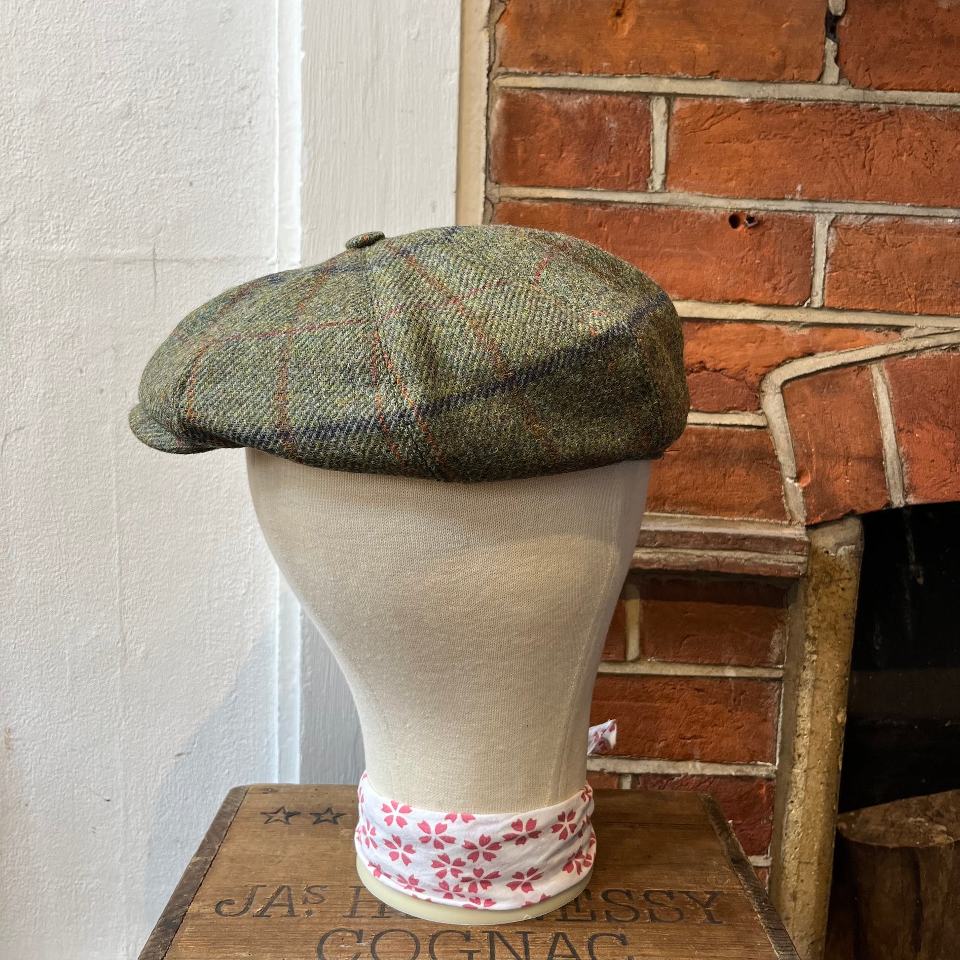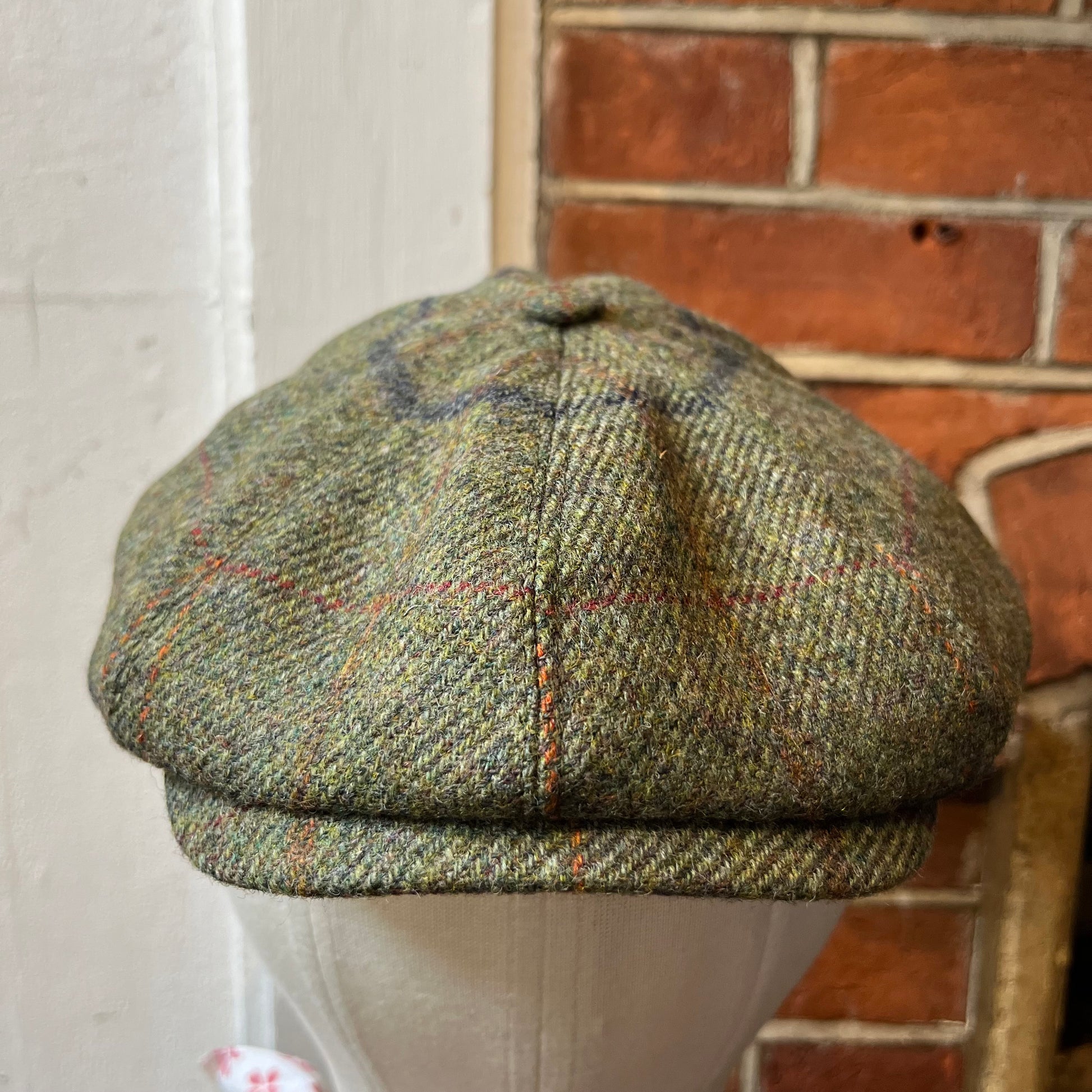 Traditional eight-piece Baker Boy cap in green tweed with a blue and red overcheck. The Baker Boy cap, also known as a Newsboy cap or Spitfire cap, is the flat cap's edgier cousin coming right back into fashion thanks to the stylish costume design in shows such as Peaky Blinders. All our caps are made in England from surplus or discontinued cloths to make good use of the whole rolls of fabric we source.