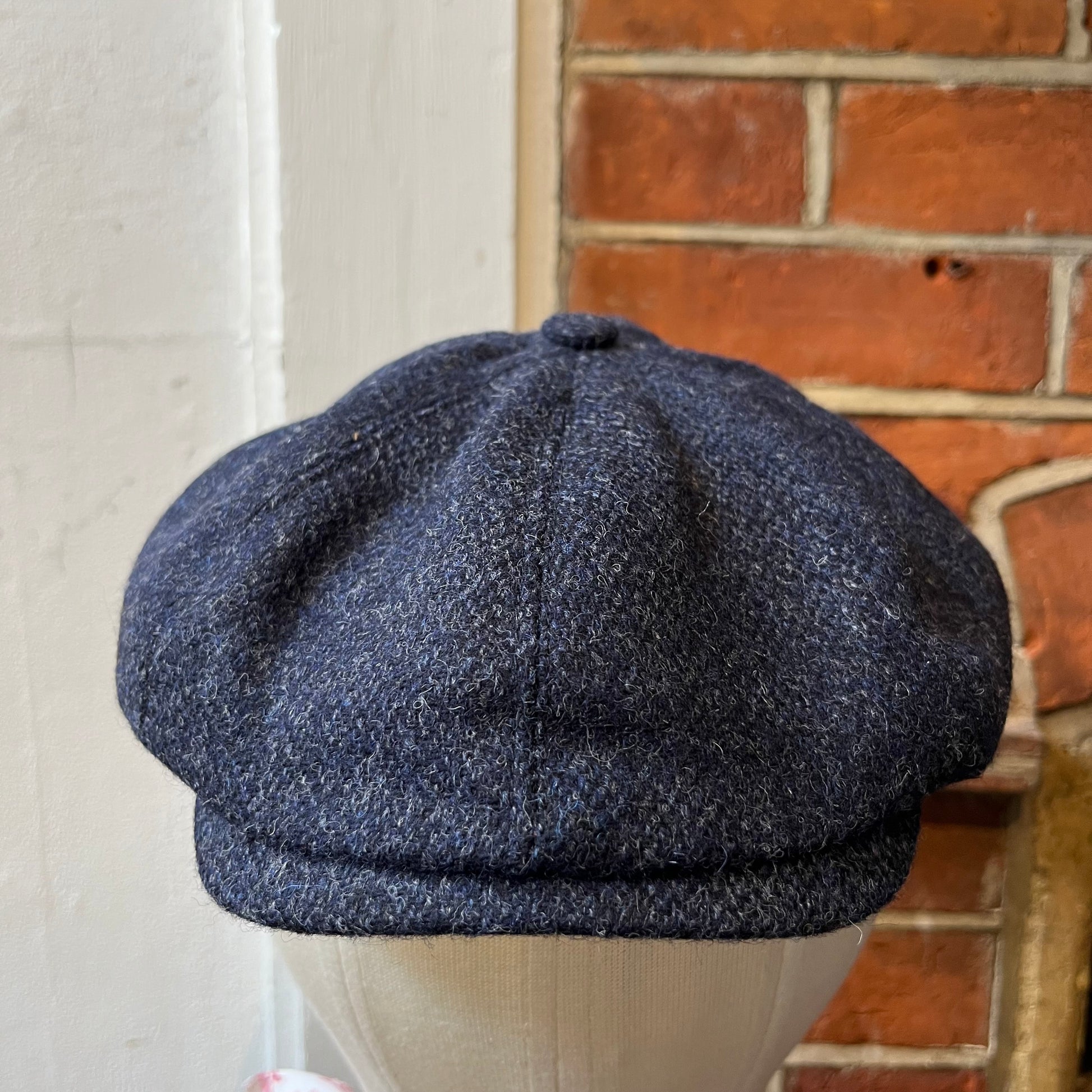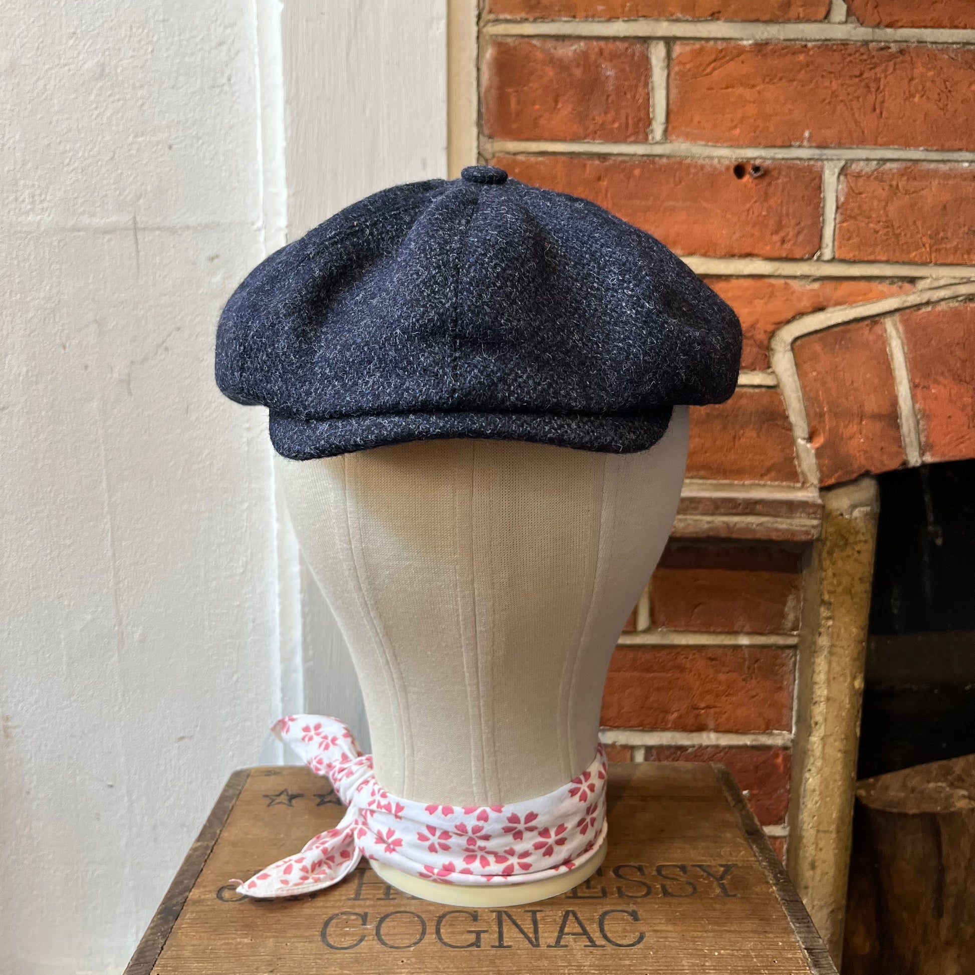 Traditional eight-piece Baker Boy cap in a navy herringbone tweed. The Baker Boy cap, also known as a Newsboy cap or Spitfire cap, is the flat cap's edgier cousin coming right back into fashion thanks to the stylish costume design in shows such as Peaky Blinders. All our caps are made in England from surplus or discontinued cloths to make good use of the whole rolls of fabric we source.