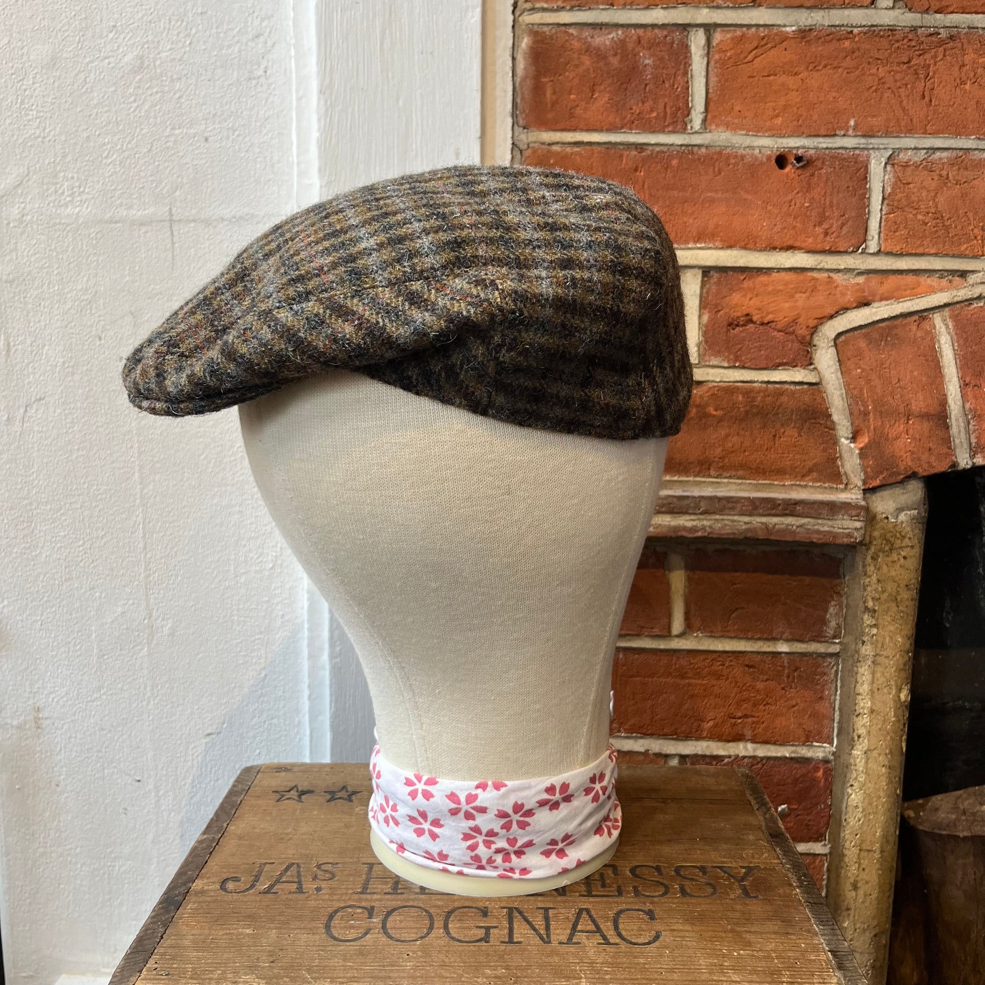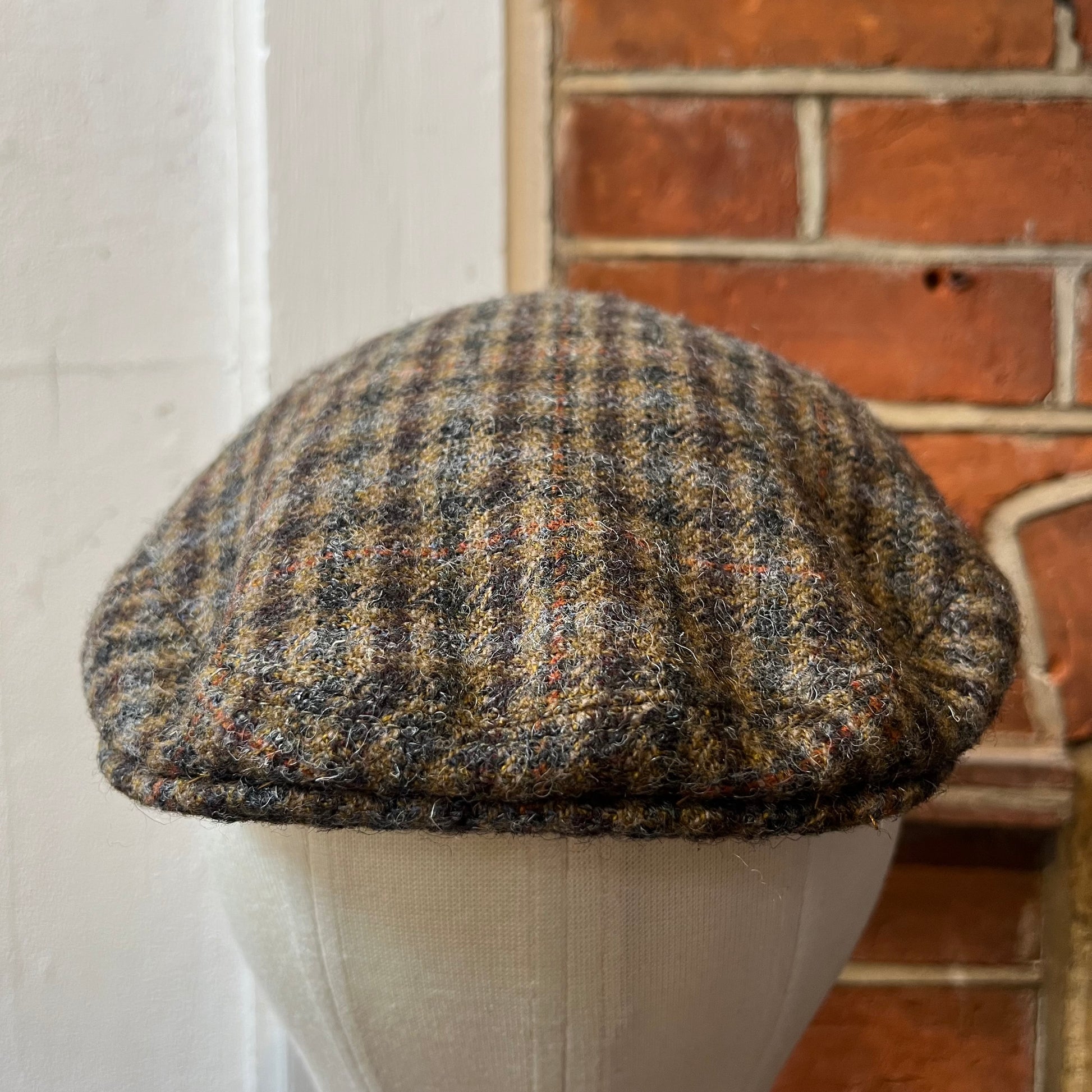 Traditional flat cap in brown tweed checked pattern with orange and grey. A classic cap which evokes images of traditional scenes, such as bread deliveries on Shaftesbury's Gold Hill, rounding off your outfit with a hat that is both right back in style, and practical. The flat caps' design, more so than its baker boy cousin, will keep your head dry and divert water onto your outerwear during inclement weather. Use a waterproofing suede protector spray to enhance this effect further. All our caps are made in England from surplus or discontinued cloths to make good use of the whole rolls of fabric we source.