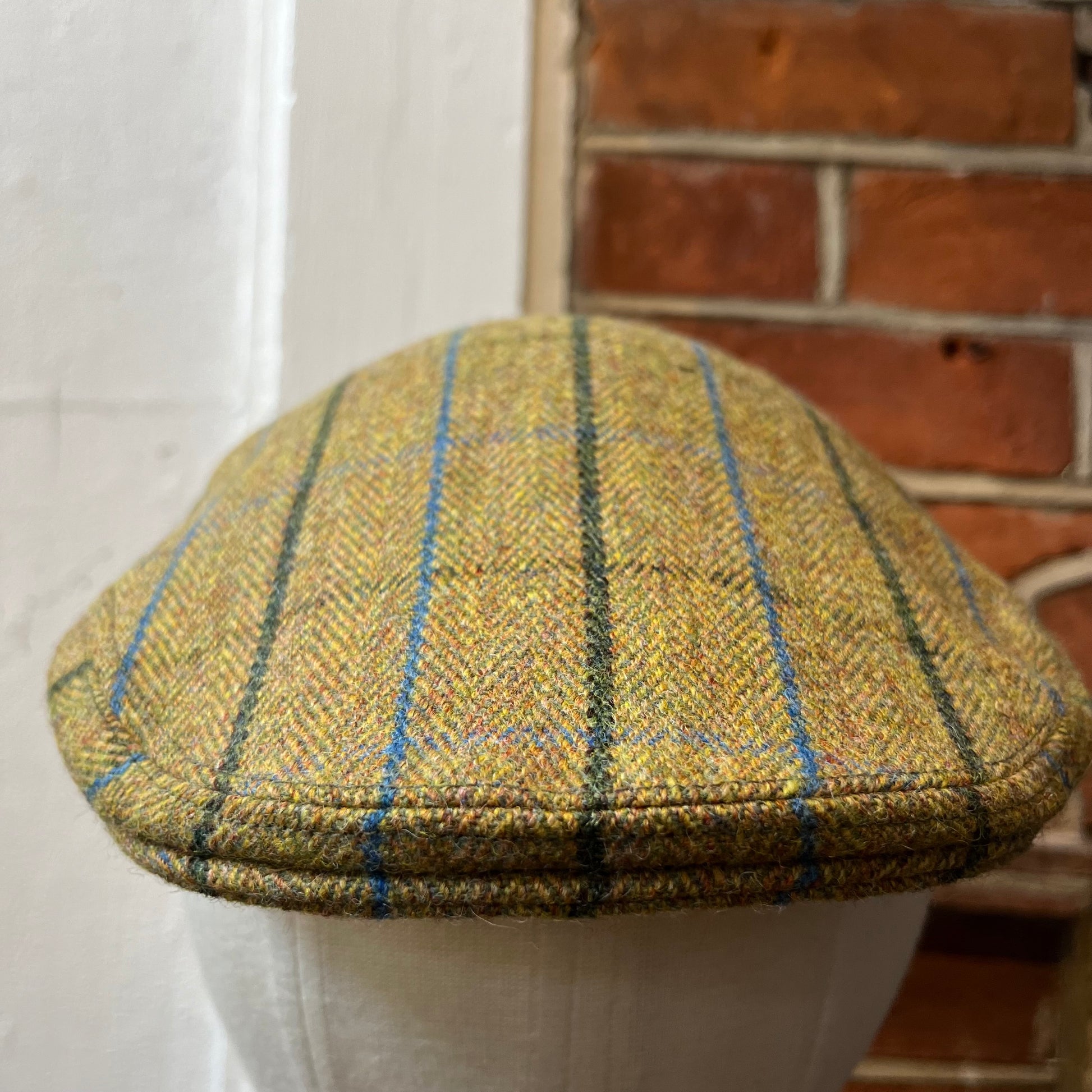 Traditional flat cap in a golden green tweed with forest green and sky blue overcheck. A classic cap which evokes images of traditional scenes, such as bread deliveries on Shaftesbury's Gold Hill, rounding off your outfit with a hat that is both right back in style, and practical. The flat caps' design, more so than its baker boy cousin, will keep your head dry and divert water onto your outerwear during inclement weather. Use a waterproofing suede protector spray to enhance this effect further. All our caps are made in England from surplus or discontinued cloths to make good use of the whole rolls of fabric we source.