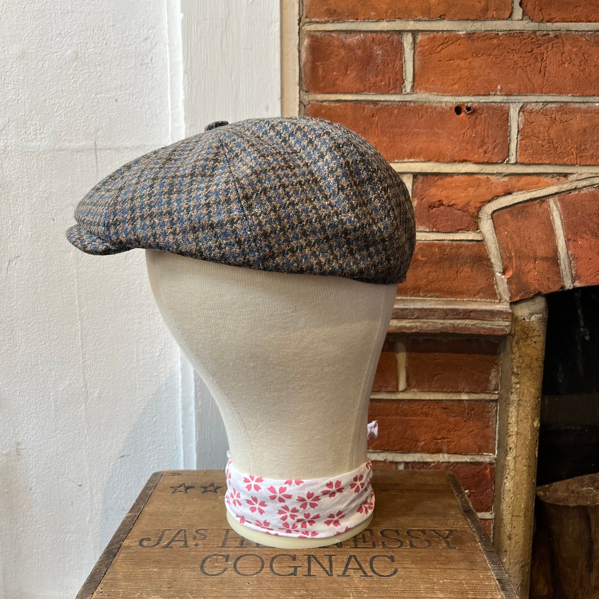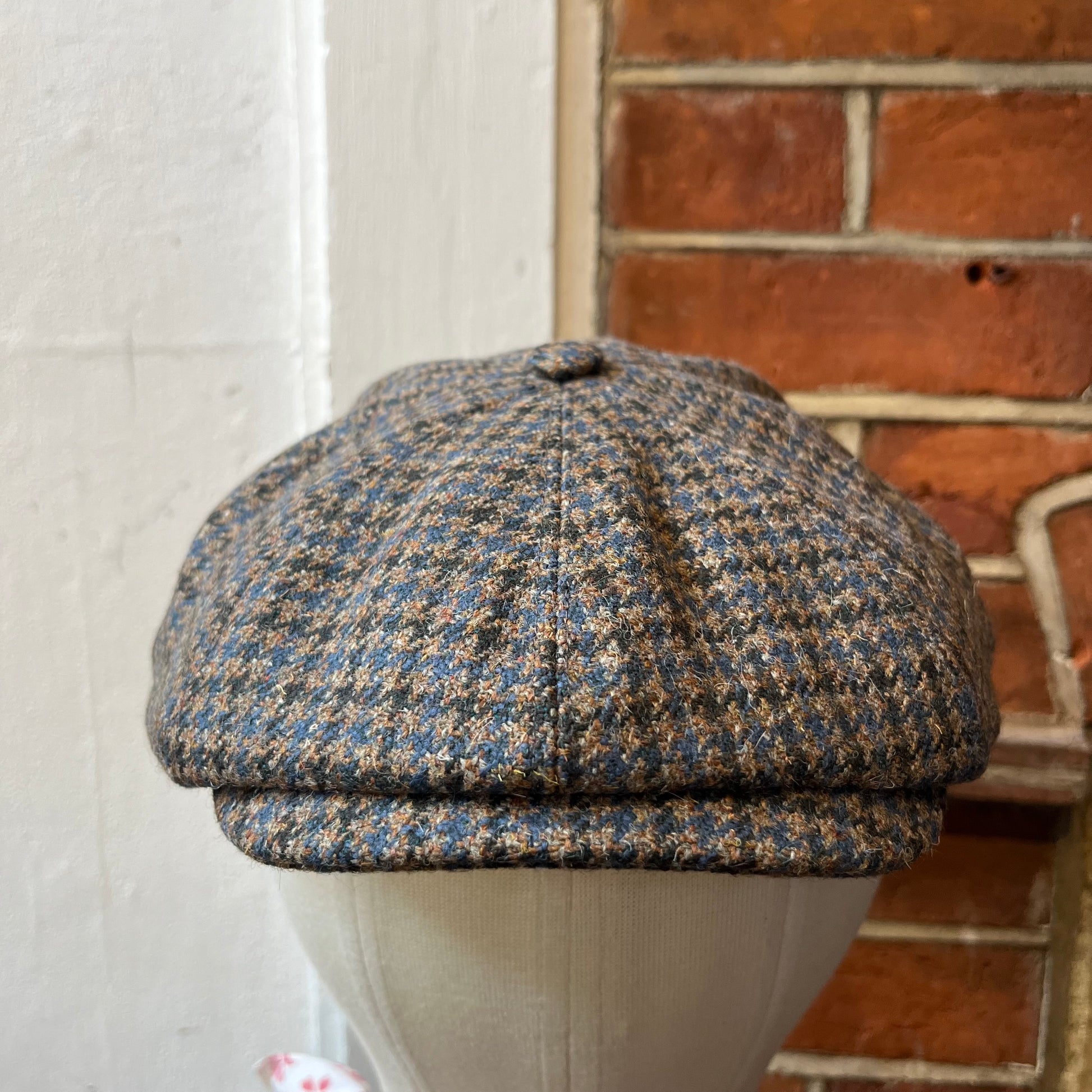 Traditional eight-piece Baker Boy cap in a blue and green houndstooth pattern - a traditional and textured pattern. The Baker Boy cap, also known as a Newsboy cap or Spitfire cap, is the flat cap's edgier cousin coming right back into fashion thanks to the stylish costume design in shows such as Peaky Blinders. All our caps are made in England from surplus or discontinued cloths to make good use of the whole rolls of fabric we source.