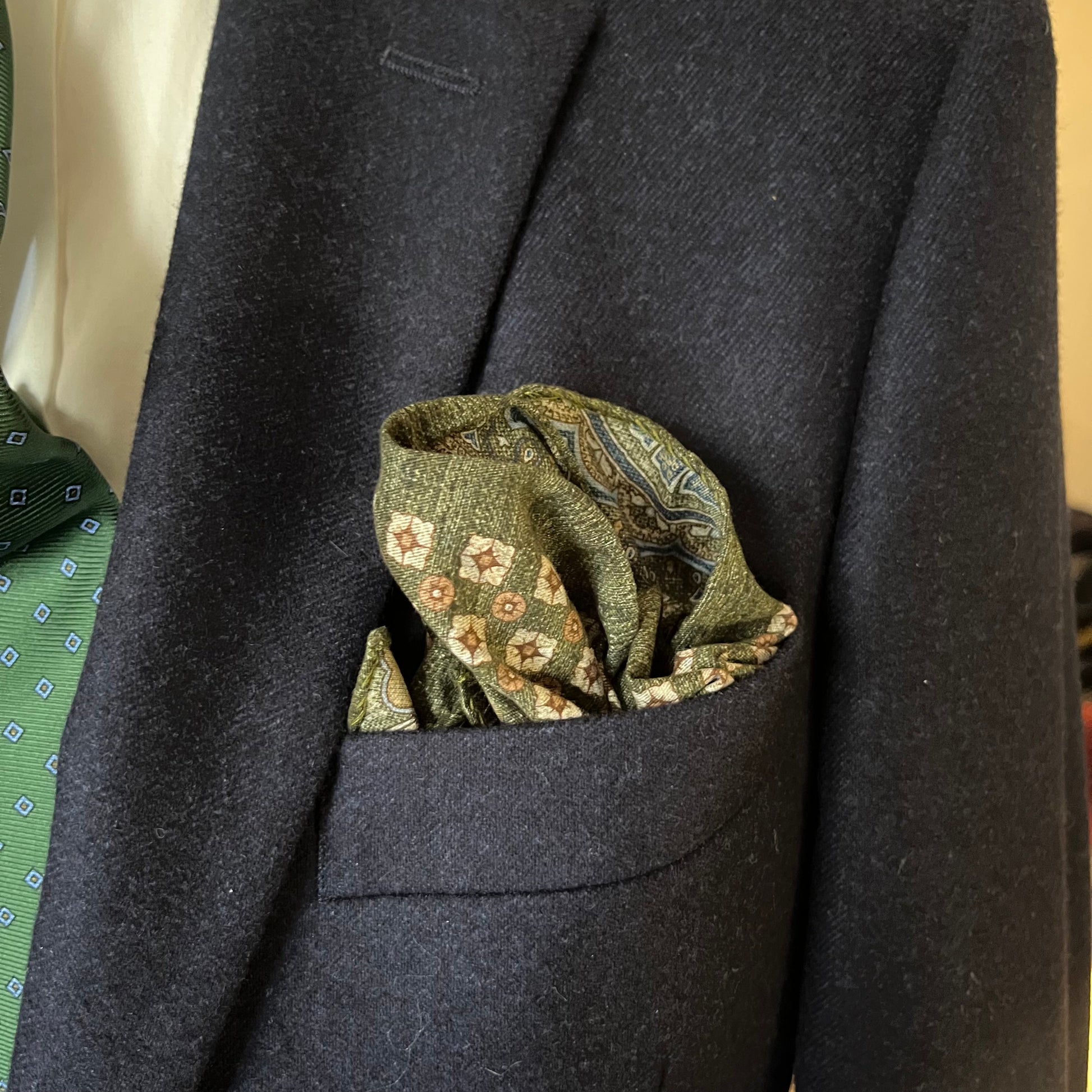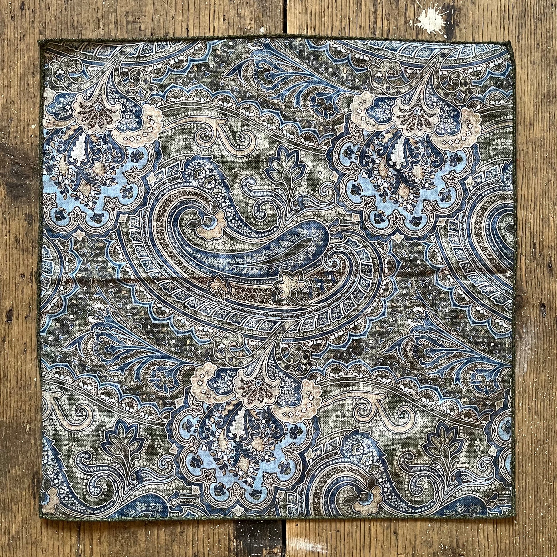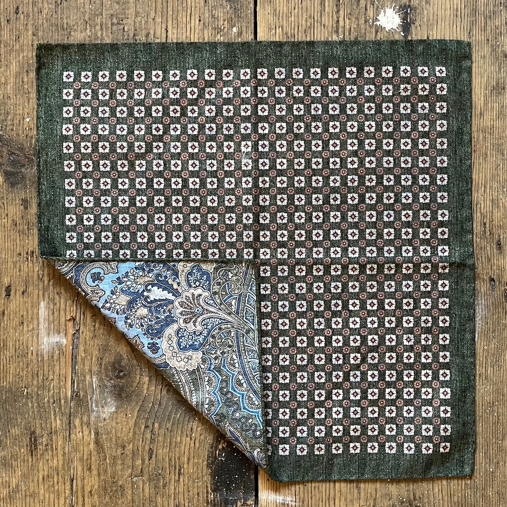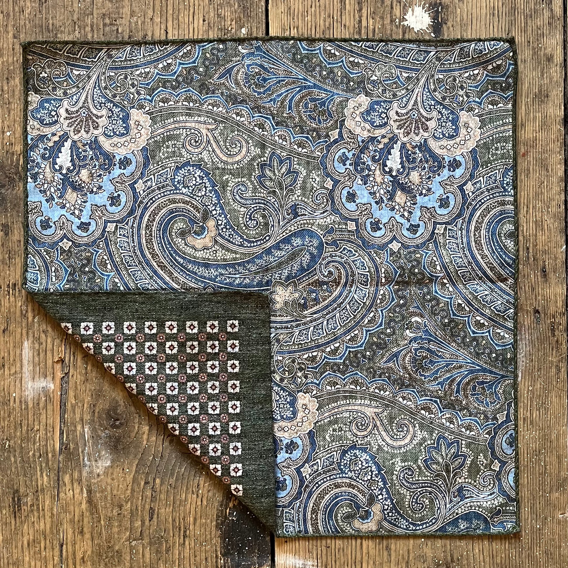 A truly versatile design from Amanda Christensen this cotton pocket square has a refined green and burgundy pattern on one side with a complementary blue and green paisley on the reverse. The soft cotton retains a feeling of structure and can be folded (or scrunched) into a variety of styles to suit you styling wishes.