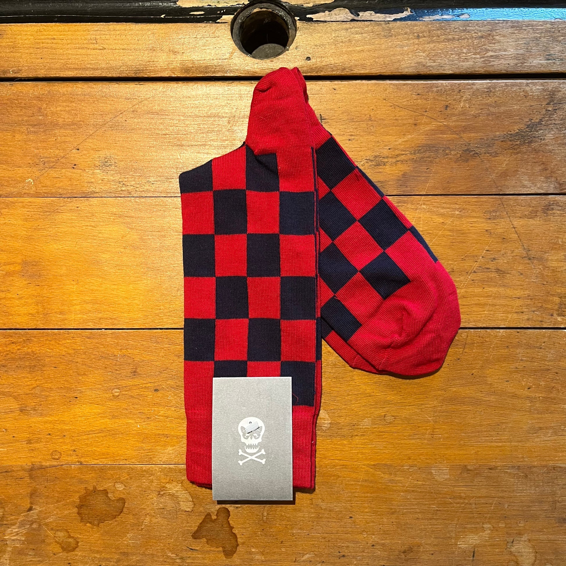 Luxury cotton socks with acrylic for durability. Made in the UK, these cosy cotton socks promise to enhance the space between the hem of your trousers and your shoes as keep your feet feeling snug and stylish, regardless of the occasion. 80% cotton and 20% acrylic. These playful tiles of red and navy will elevate your outfit from the ground up.