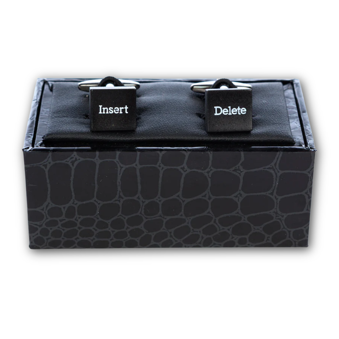 Push all the right buttons with these 'Insert' and 'Delete' keyboard cufflinks from Regent. Presented in a black box.