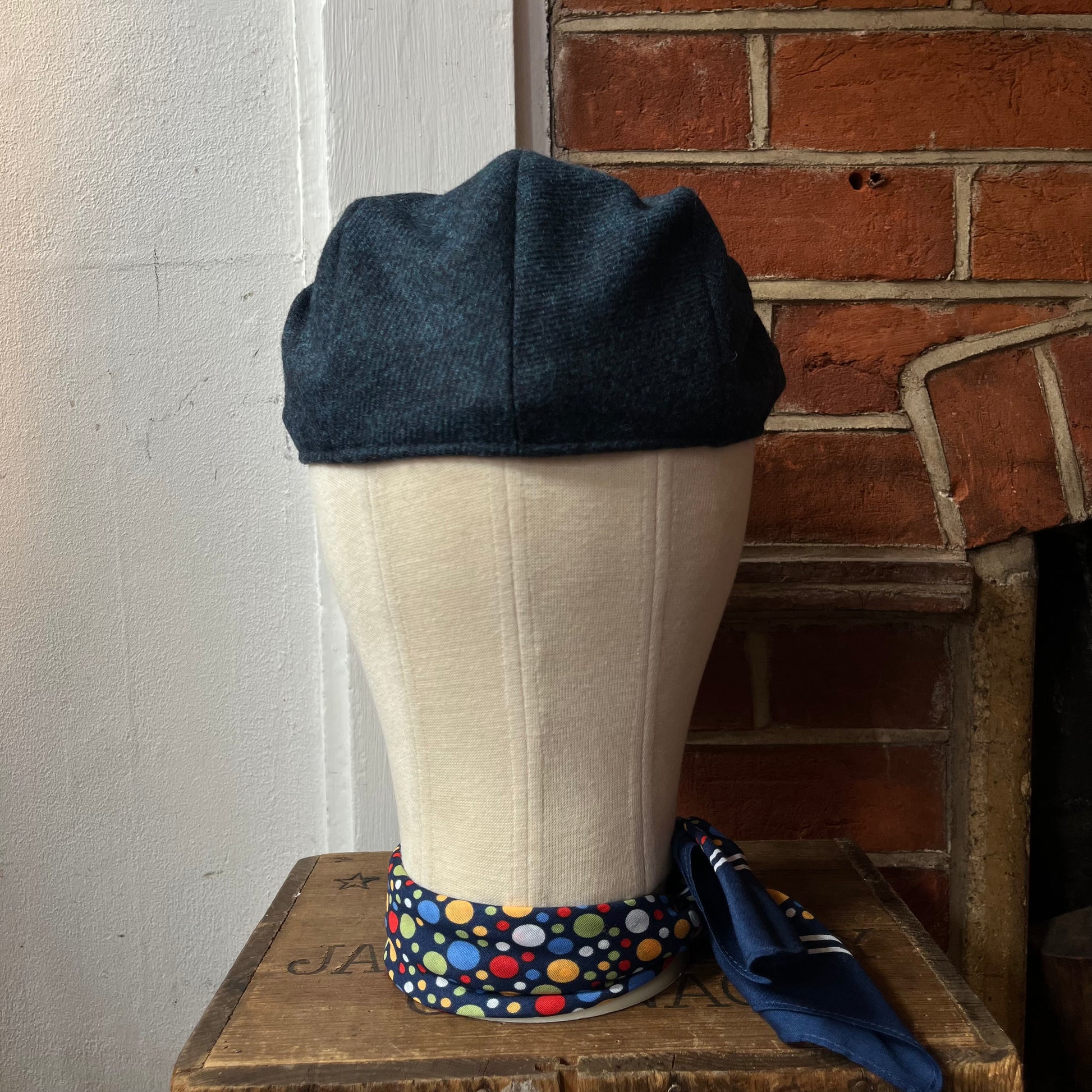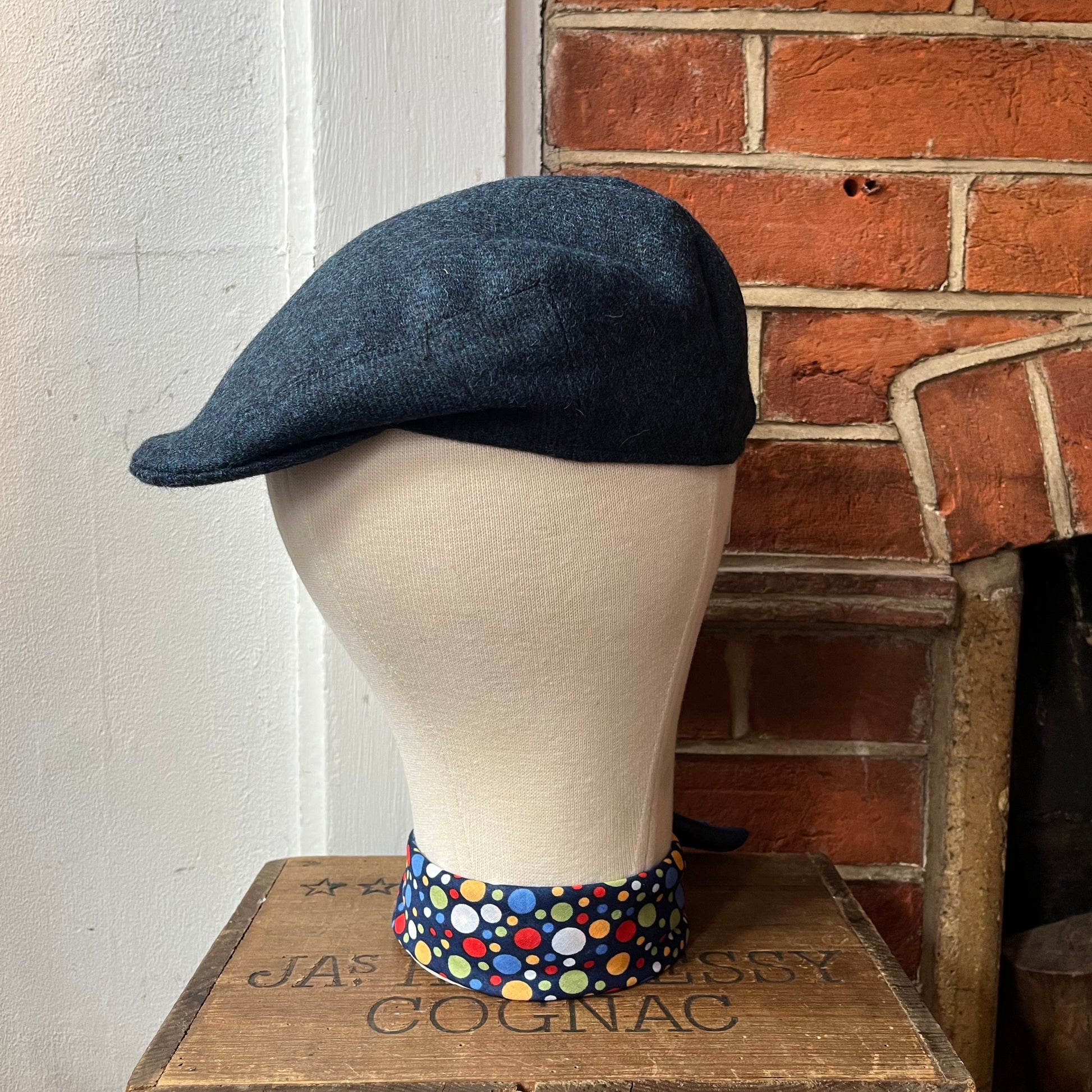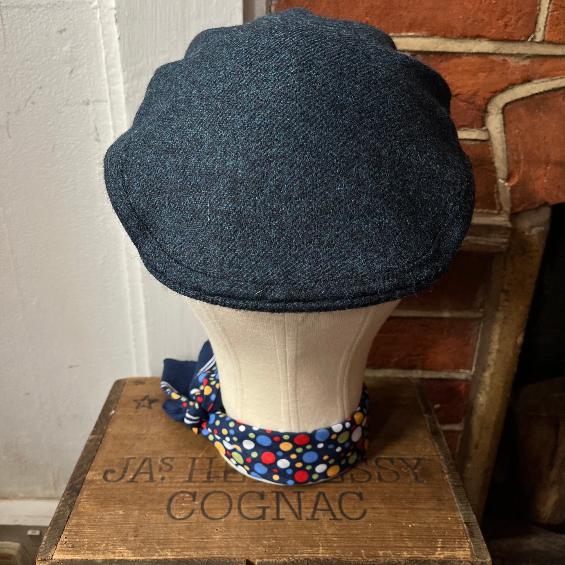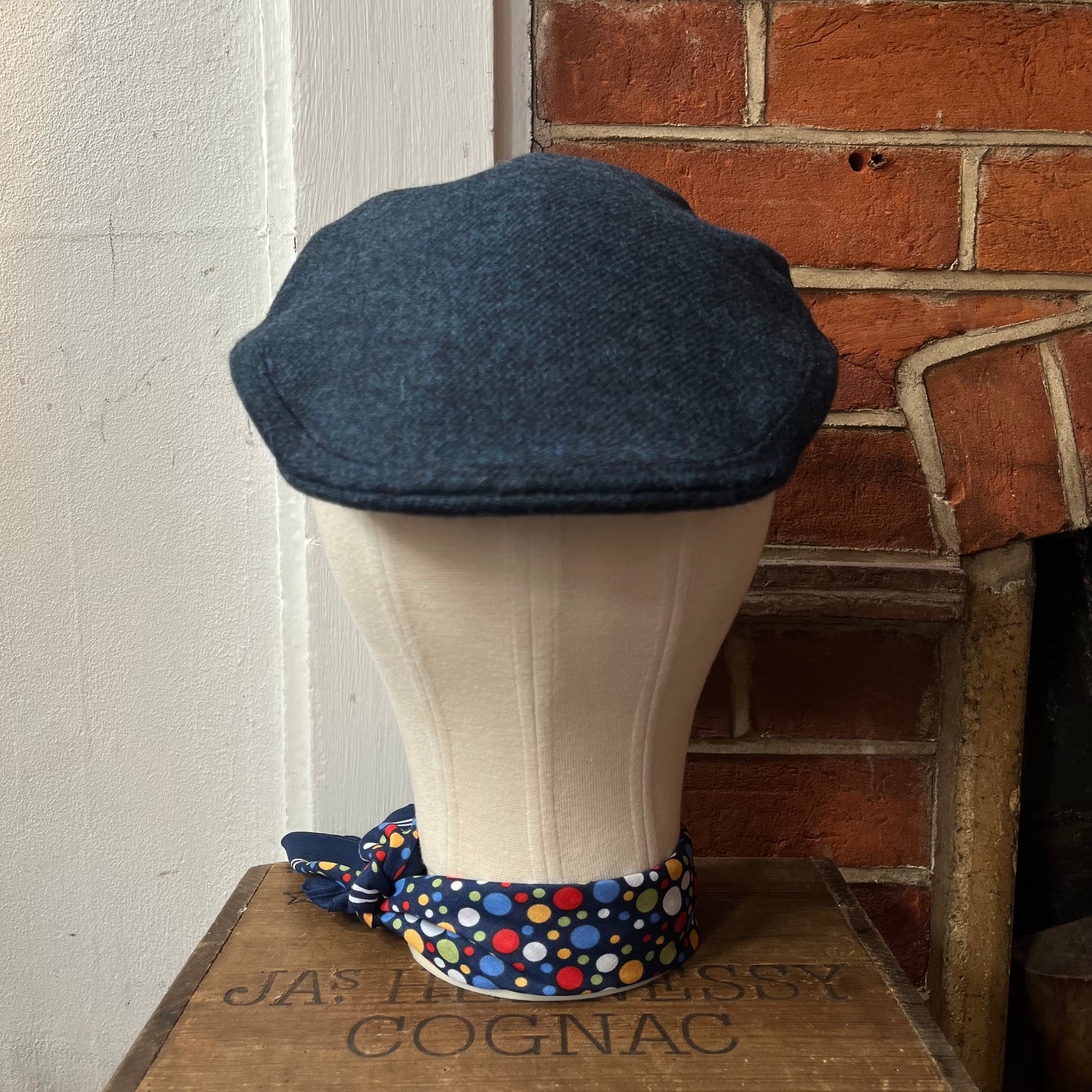 British-made wool Thistle Fleck Navy flat cap with peacock tweed that has subtle tones of green and turquoise woven throughout, creating unique iridescent effects depending on lighting designed and stocked exclusively by Regent, perfect for warmer weather. Regent provides the perfect range of well-made, expertly cut, no-nonsense flat caps, all made in the UK and bristling with heritage. An all-time classic, great for the city and the country: an iconic garment that still feels authentic and timeless. Made from the best cloth with a comfortable lining and a dynamic fit, this'll be your go-to favourite, suitable for any outfit, any style, all the time. We also have an eight piece if you prefer a more baker boy hat look. We used our leftover scraps from our "Shearer" waistcoat ensuring we continue to practice ethical fashion whilst still creating timeless items that not only matches with our existing items but also creating a piece that speaks for itself!