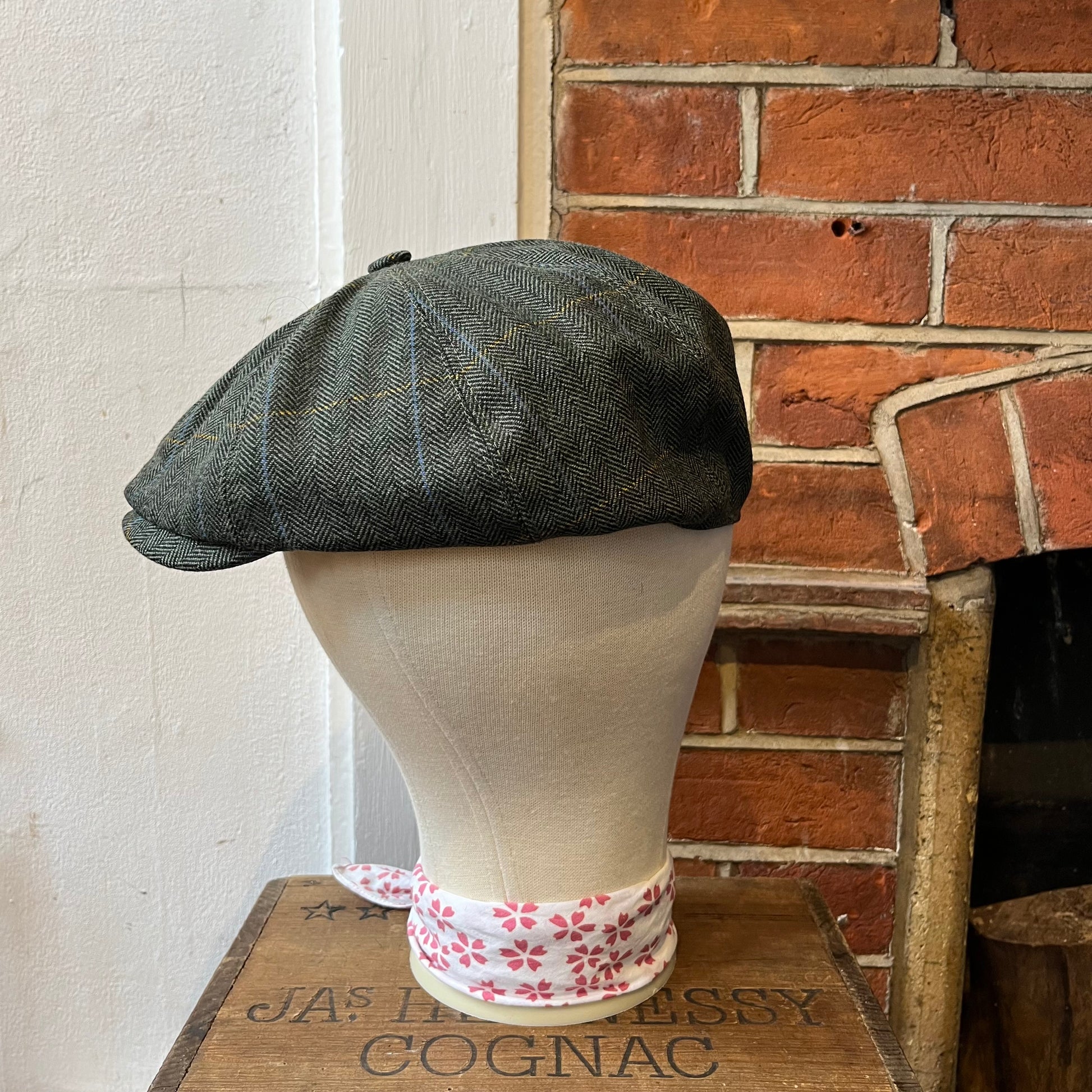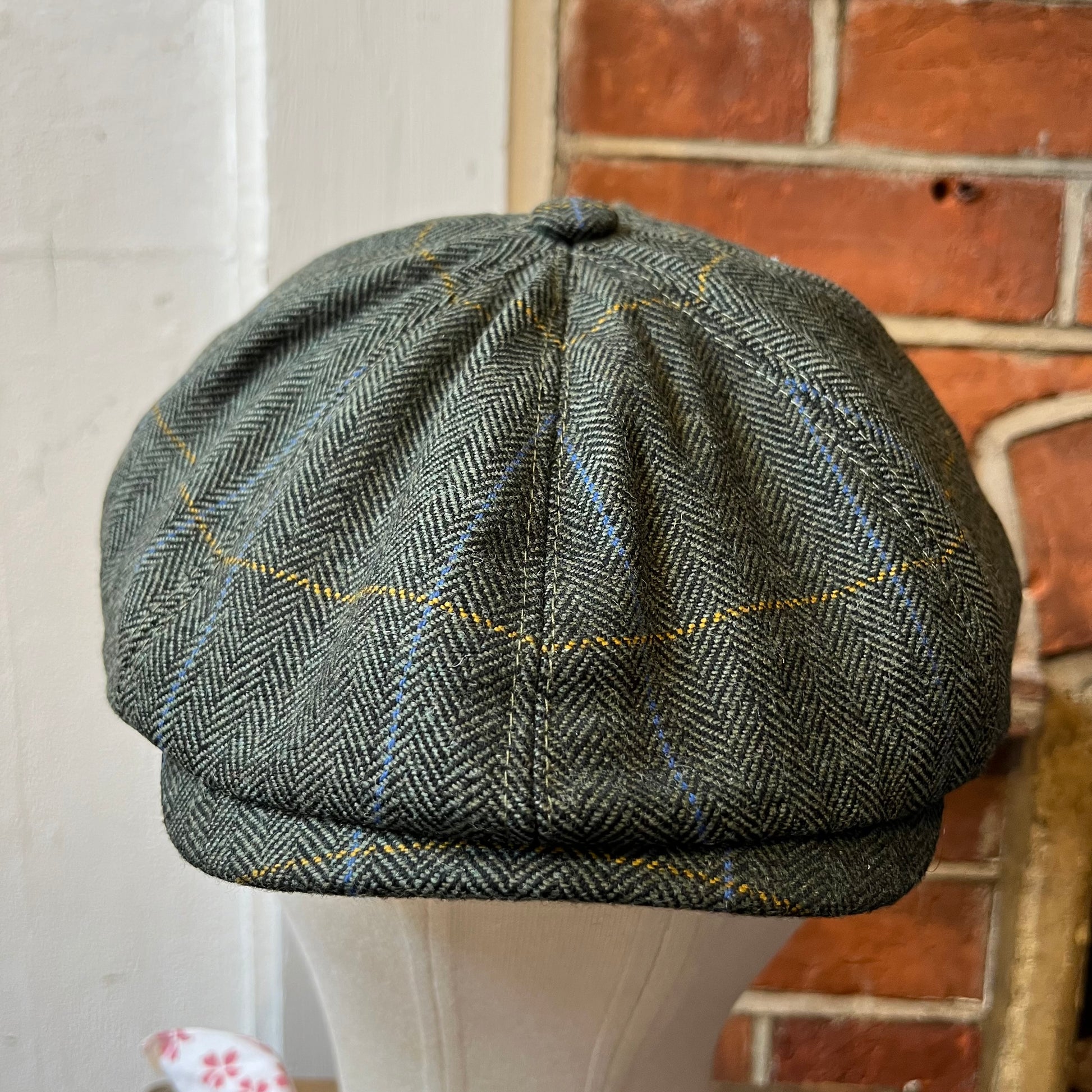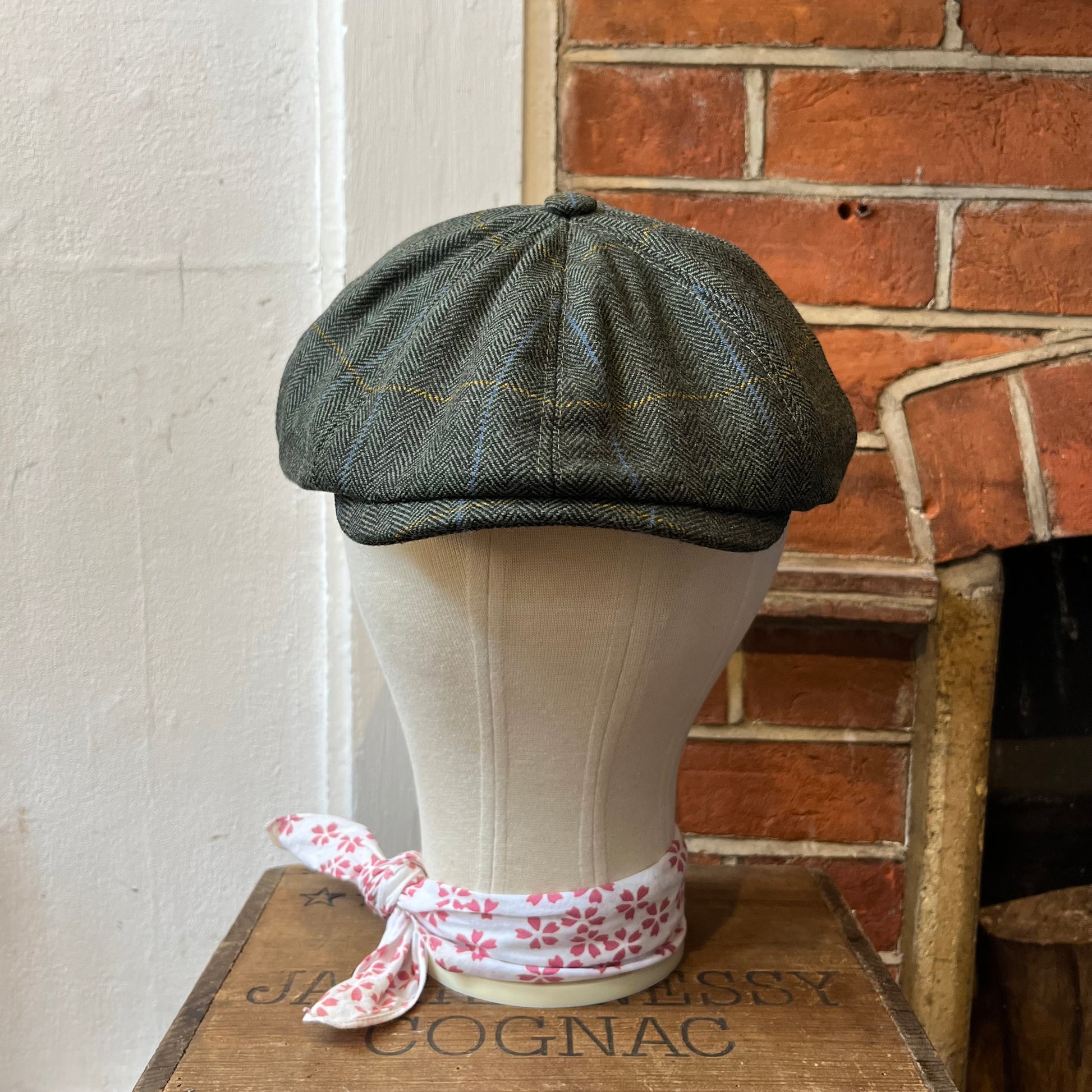 Traditional eight-piece Baker Boy cap in a richly textured green herringbone tweed with a colourful yet subtle yellow and sky blue overcheck. The Baker Boy cap, also known as a Newsboy cap or Spitfire cap, is the flat cap's edgier cousin coming right back into fashion thanks to the stylish costume design in shows such as Peaky Blinders. All our caps are made in England from surplus or discontinued cloths to make good use of the whole rolls of fabric we source.