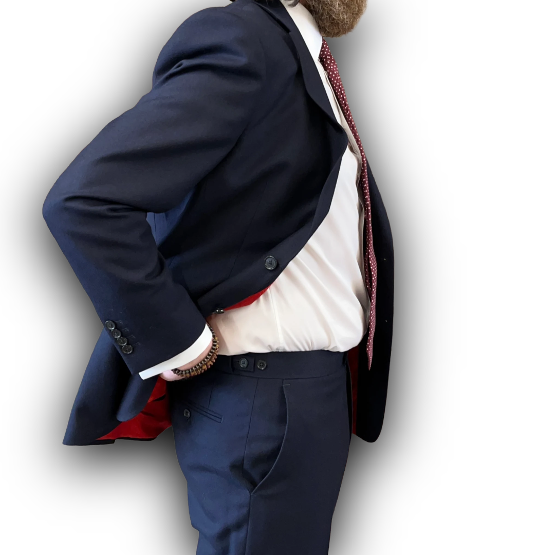 The Ian suit features a double vented, two-button jacket with a red lining, giving the suit a sharp finishing twist, indicating that there's more to the wearer than meets the eye. It's styled with two flap pockets, a welted chest pocket and a sham four button cuff. Trousers come complete with side adjusters, french bearer button and brace buttons.