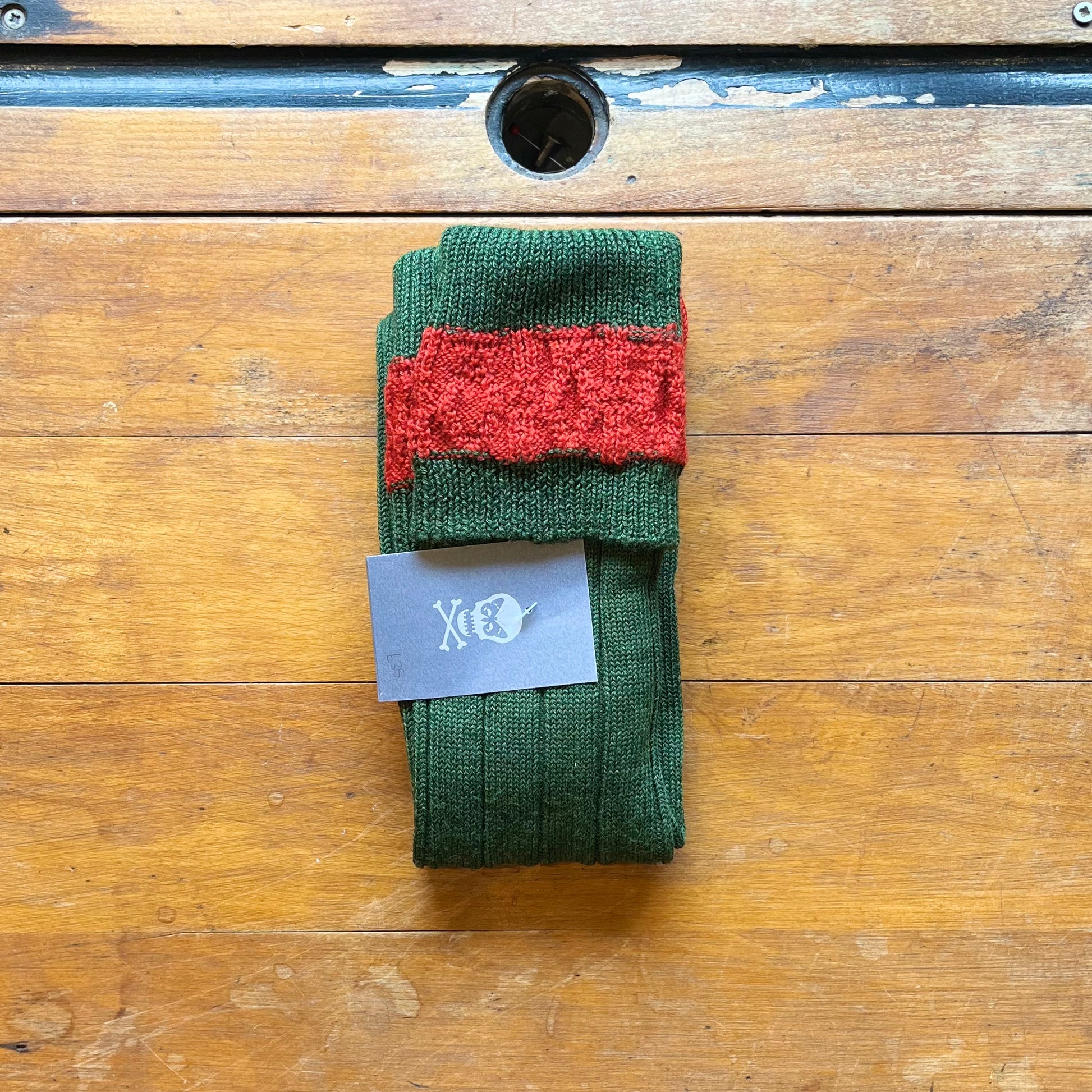 Luxury woollen boot socks made and designed exclusively by Regent, featuring thick rib-knit construction in military green with contrasting crimson on a stripe at the cuff, and on the heel and toe. Made in the UK with 80% wool and 20% nylon, these long boot socks are practical for all outdoor and country pursuits. Whether you are crashing through the bracken of the undergrowth on a shoot, reading by the fire, or lining wellies for a muddy walk, these are the socks for you.