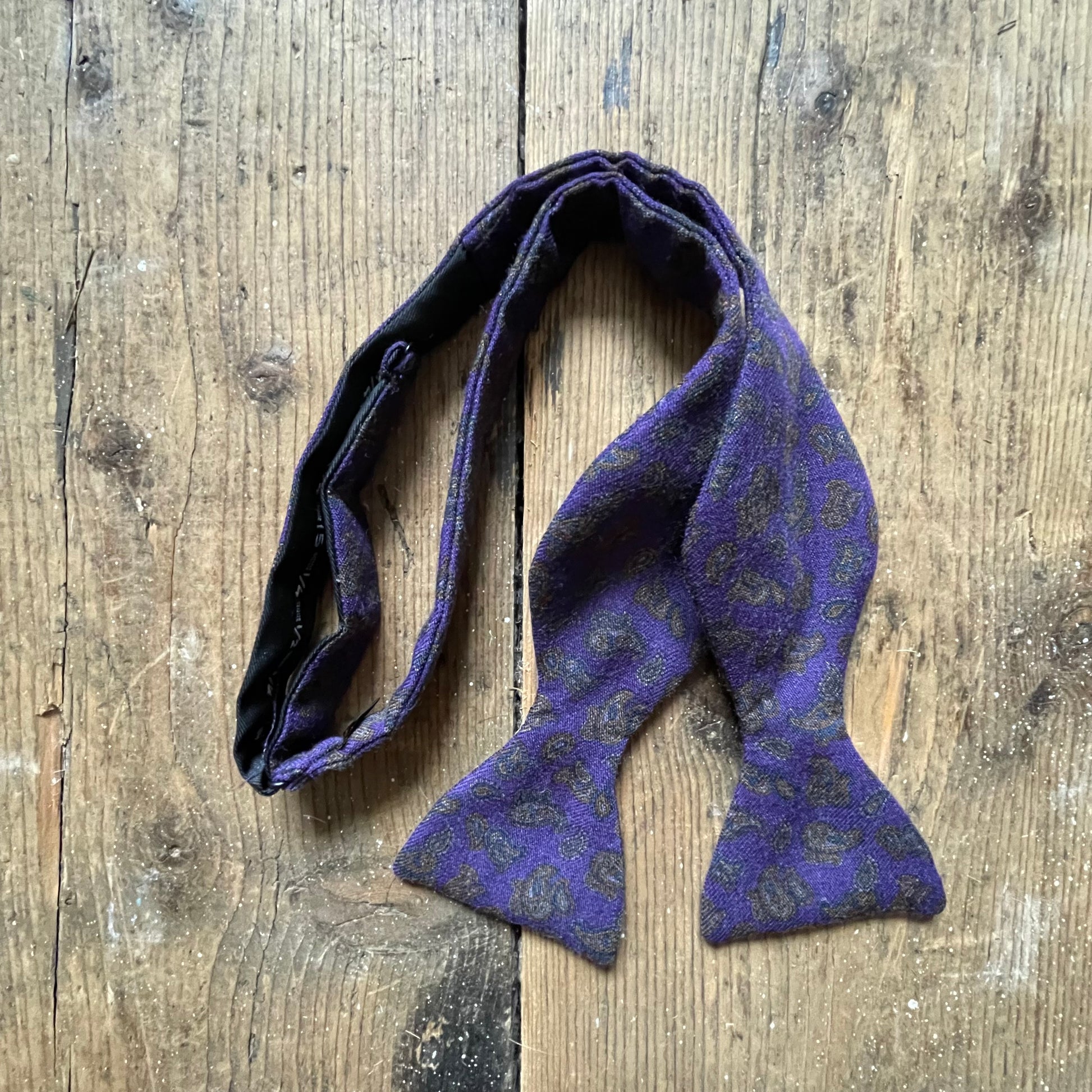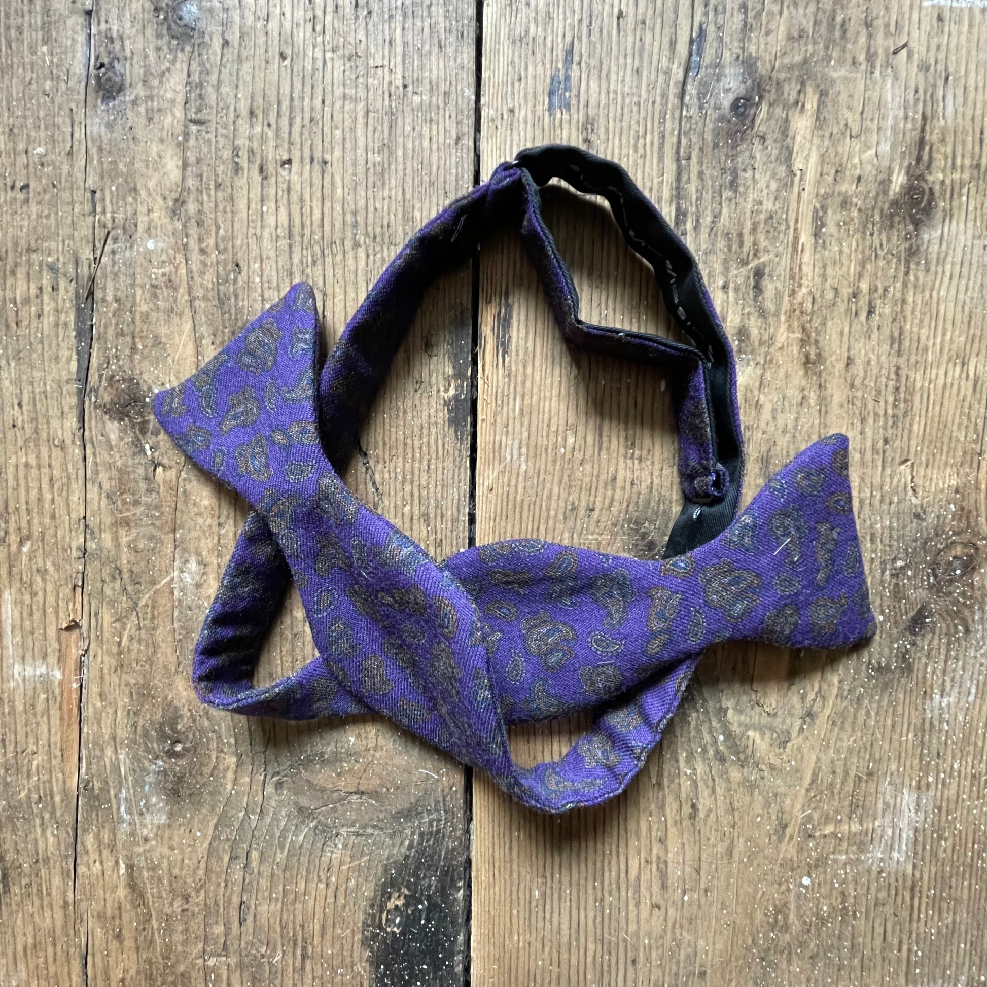 This Regent bow tie is made from pure wool and features a beautiful paisley design adding texture to your formal outfit. Navy and bronze paisley adorn a subtle purple background. Wool ties are a lovely way to appear less formal yet maintain the essential elements of men's.