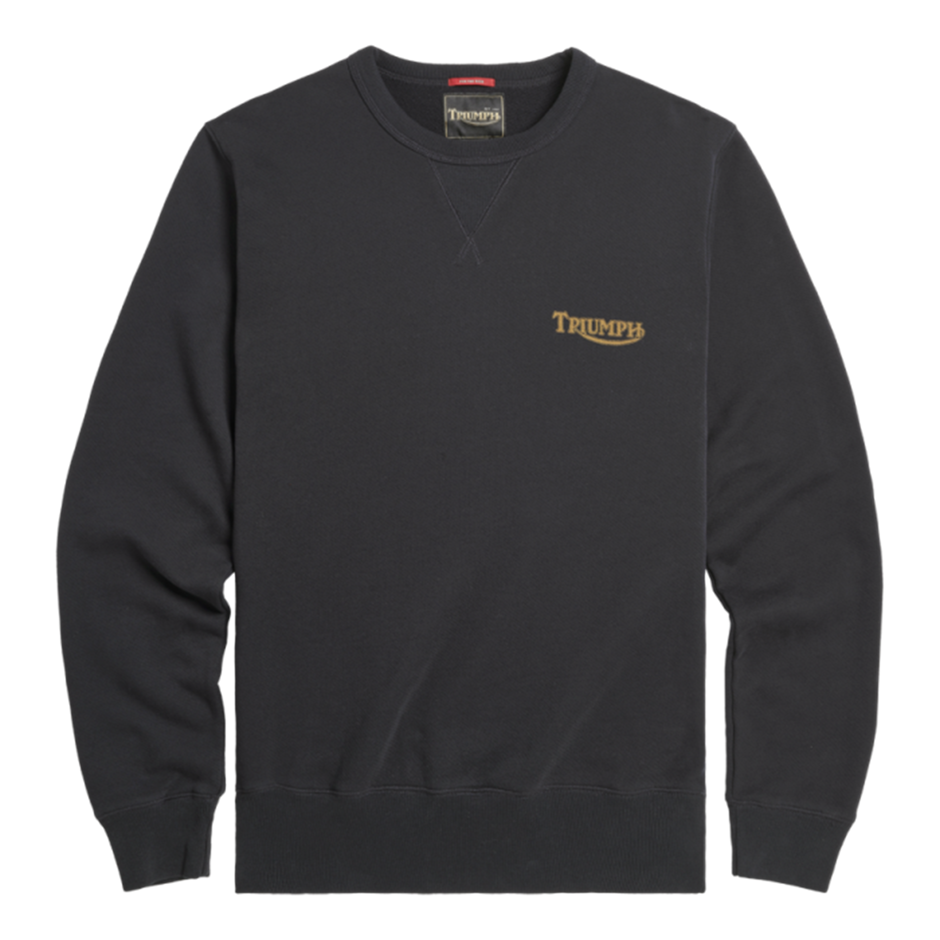 The classic crew done right, Circuit uses black heavyweight 400gsm cotton twill sweat to bring true versatile comfort that adds style to any occasion. This regular-fit sweat is finished with classic ribbed V-insert at neck, ribbed cuffs and hem, and a subtle Triumph heritage logo in gold print to the left chest.