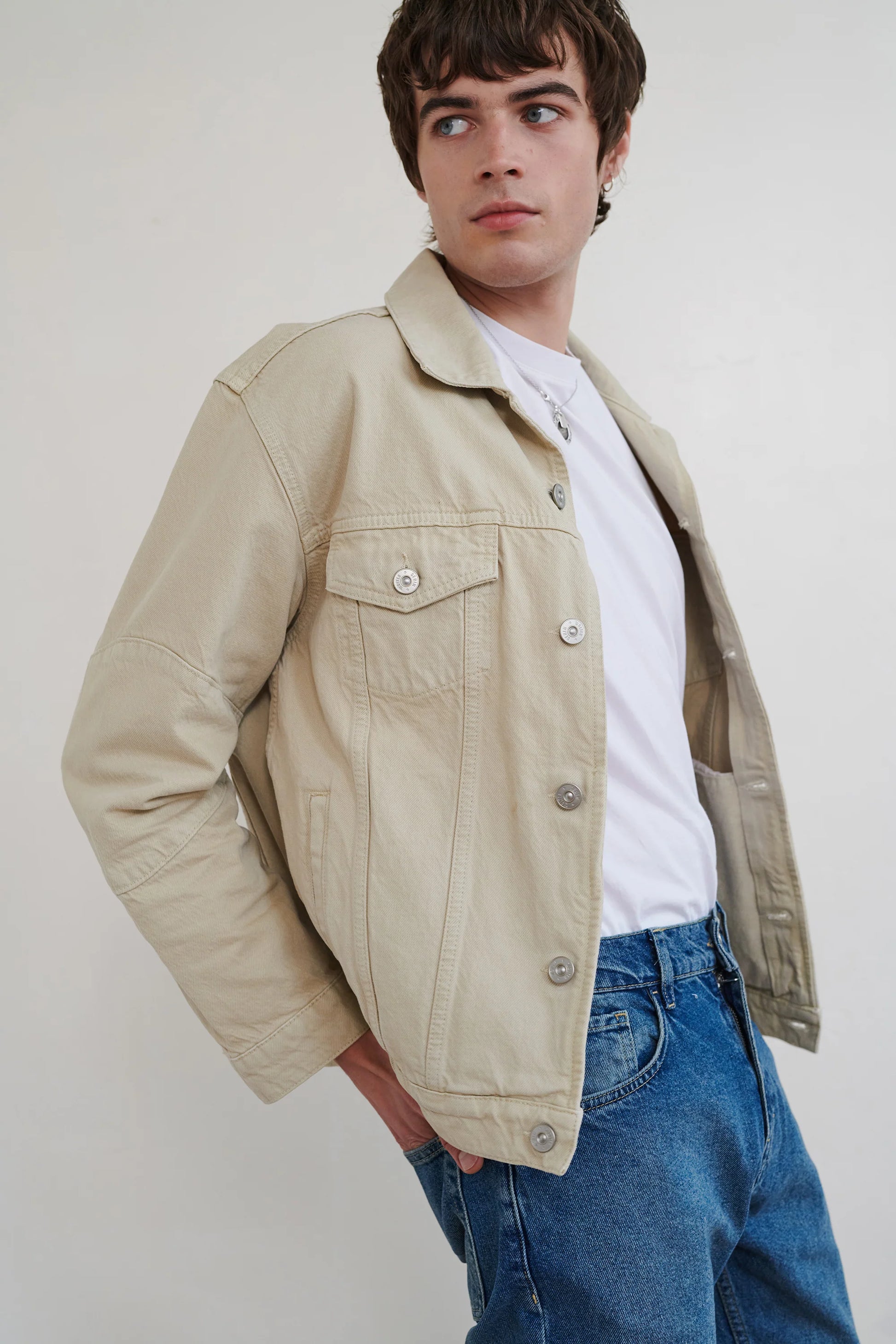 This denim jacket has a vintage feel but with a modern and relaxed fit. It's perfect for layering. The jacket is made with 13oz cotton denim, dyed to a warm stone colour and then rinsed for a soft touch. The fabric is sourced from Ayyildiz in Turkey and is deadstock. Key details include an open 'revere' style collar, six pockets, removable buttons, and back waist adjusters.